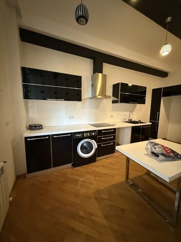 - Dizayn: Qara parlaq fasadlı, ağ işçi səthli müasir “L” planlı mətbəx garnituru. Yuxarı və aşağı şkaflar, geniş çekmecələr, açıq rəf bölməsi.