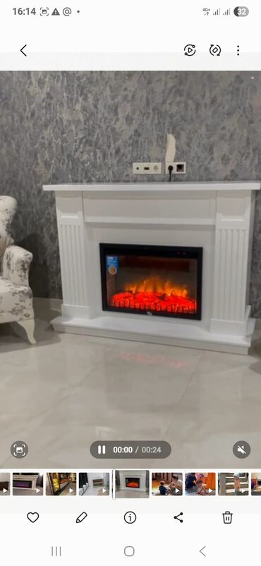 - Elektrik kamin: klassik ağ portal, 3D alov effekti olan ekranlı ocaq bloku; isti atmosfer yaradır və interyerə dekorativ vurğu qatır.