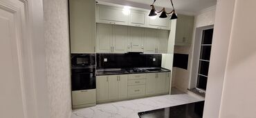 - Klassik üslubda, açıq yaşıl rəngli mətbəx dəsti: yuxarı-aşağı dolablar, çekmecələr və vitrinli bölmələr. Fasadlarda dekorativ frezələr, metallik tutacaqlar.