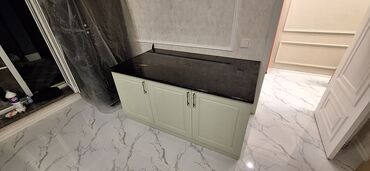 - Ayrı ada/bufet modul: qara masaüstü ilə, üç qapılı geniş saxlama hissəsi.