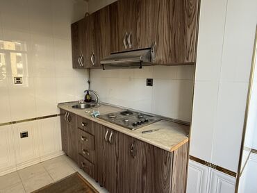 BINEQEDI kiraye!!!Mətbəx mebel dəsti və məişət texnikası komplekti Tərkib: - Asma qəhvəyi rəngli şkaflar (2 qapılı bölmələr, metal tutacaqlar) - Alt şkaflar: qaz plitəsi üçün bölmə, iki qapılı sa...