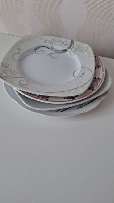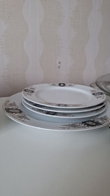 - Dairəvi porselen boşqablar: klassik ağ və çiçək ornamentli haşiyəli modellərdən ibarət bir neçə ədəd.