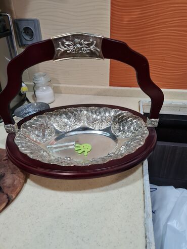 - Dekorativ servis səbəti: gümüş tonlu metal kasalı, üzərində işləməli ornamentlər, qırmızı-qəhvəyi taxta (taxta efektli) sapla daşınır; meyvə, şirniyyat və çərəzlərin servisi üçün.