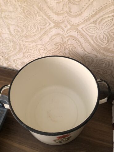 - Emallı qazan: ağ gövdə, iki yan dəstəkli, yaşıl qapaq və taxta tutacaq; üzərində çiçək naxışı. Şorba, plov, mürəbbə və gündəlik yeməklər üçün rahat həcm.