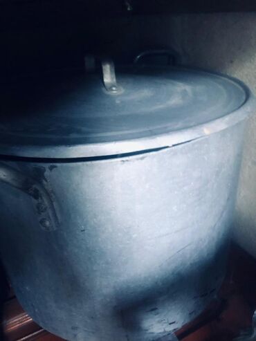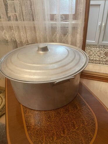 - Böyük alüminium qazan: qalın divarlı, genişhəcmli, dairəvi qapaqlı. İki möhkəm yanal tutacaqla rahat daşınır. Kütləvi yeməklər, aş, plov, şorba, doğrama və konservləşdirmə üçün uyğundur. Qapağın üstündə tutacaq var, istiliyi yaxşı saxlayır.