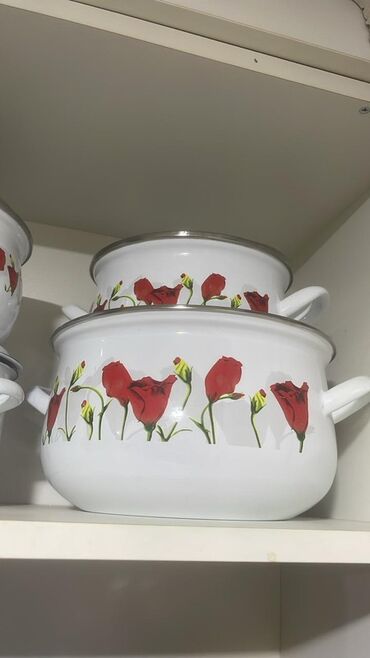 Gül naxışları ilə bəzədilmiş emaye bişirmə qazan dəsti. Dəstə üç müxtəlif ölçülü qazan daxildir, hər birinin öz qapağı var. Bu qazanlar müxtəlif növ yeməklərin hazırlanması üçün uyğundur.