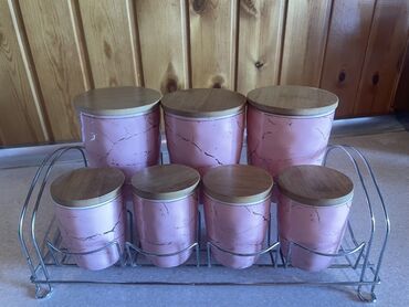 - Dəst tərkibi: 7 ədəd qab (3 böyük, 4 kiçik) + metal stend/raflı daşıyıcı
