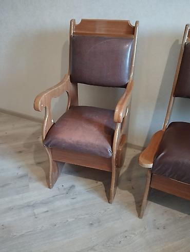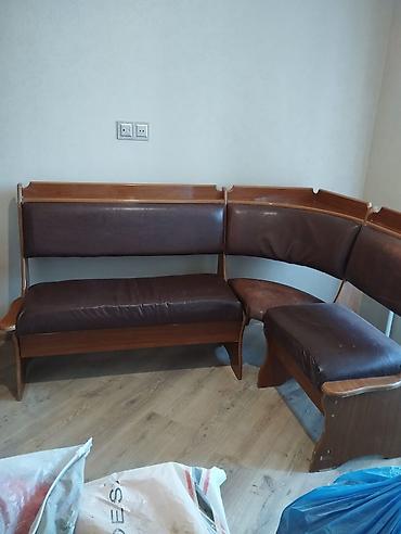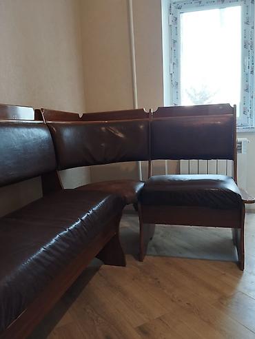 - Klassik üslubda L formalı mətbəx küncü: bərk ağac karkas, tünd qəhvəyi süni dəri oturacaq və bel hissələri.