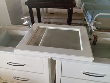 - Aşağı modul: 2 ədəd ağ rəngli şkaf–lavabo kombinasiyası. Hər birində: