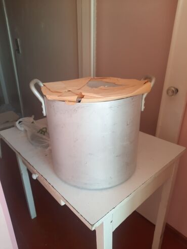 - Böyük alüminium qazan: qalın divarlı, iki möhkəm qulplu, kütləvi həcm üçün uyğundur (şorba, aş, mürəbbə və s.). Üstündə müvəqqəti örtük var.
