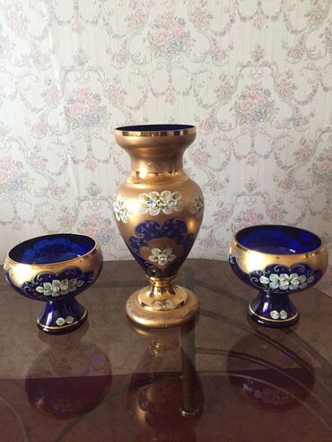 - Dekorativ şüşə dəst: 3 hissədən ibarət (1 ədəd iri vaza + 2 ədəd fincan formalı qab). Kobalt-mavi şüşə üzərində qızılı dekor və əl işi çiçək naxışları; masa, vitrin və zövqlü interyer dekoru üçün uyğundur.
