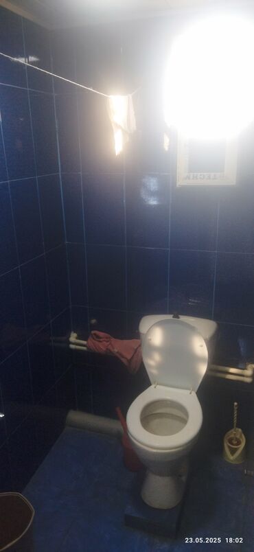- Sanitar qovşağı: unitaz, əl duşu və divara bərkidilən duş başlığı, su qarışdırıcısı, döşəmə və divarlar tünd göy kafel.