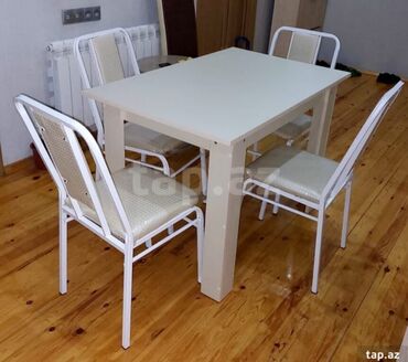 Mətbəx/yemək masası və stul dəstləri, həmçinin iş masası - 4 nəfərlik yemək masası dəsti: ağ rəngdə, sadə və möhkəm konstruksiya. Metal karkaslı stullar, oturacaq və bel hissəsi süni dəri ilə üzlə...