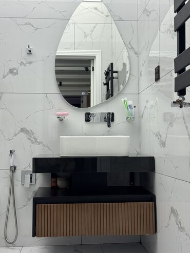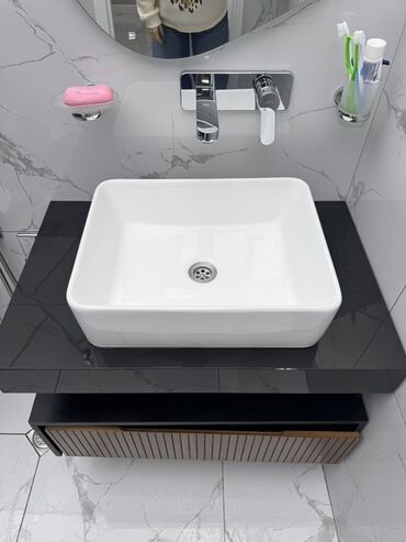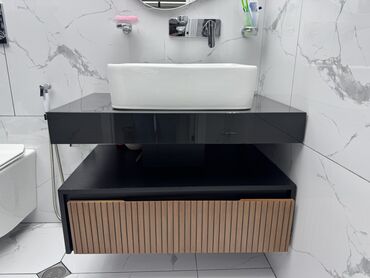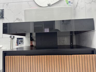 - Dizayn: Üstü parlaq qara konsollu panel, üzərində düzbucaqlı ağ üst-oturan (countertop) keramika lavabo. Alt hissədə açıq rəf və ağac teksturalı vertikal lamellərlə işlənmiş sürüşmə çekmece paneli.