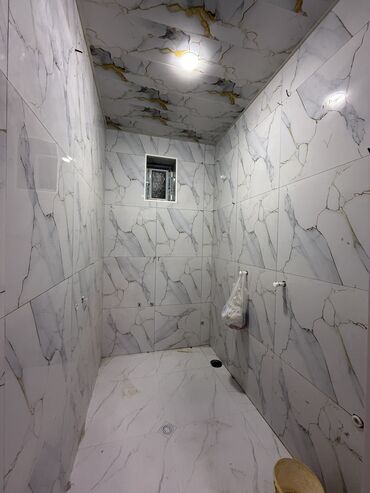 - Mətbəx zonası üçün ayrılmış sahə: divarda kommunikasiya çıxışları, mərmər naxışlı dekorativ kəmər və keramika zonası, LED işıqlı asma tavan.