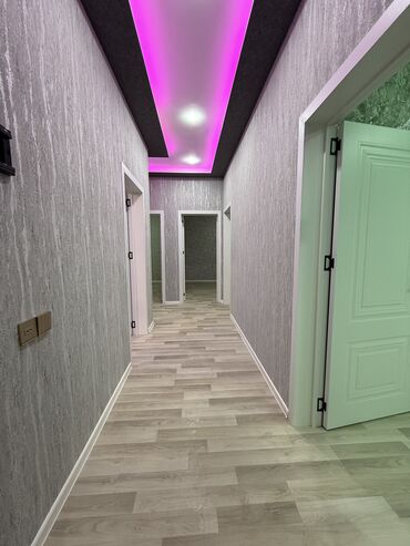 - Geniş dəhliz: açıq rəng laminat döşəmə, dekorativ divar kağızları, gizli LED işıqlandırmalı asma tavan (rəng dəyişən işıq effektləri).