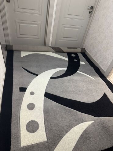 Müasir dizaynlı xalça - Ölçü: təxmini 1.50 nin 2.30 a (foto əsaslı təxmin; geniş otaqlar üçün uyğundur) - Rəng palitrası: boz, mavi və ağ tonların qarışığı; müxtəlif interyerlərlə asan uyğunlaşır...