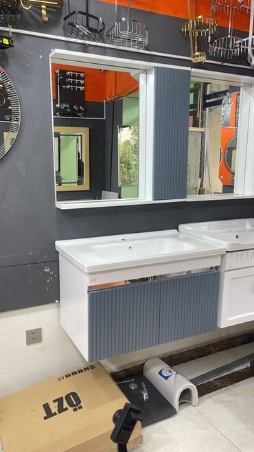 - Materiallar: Nəmlikdən qorunan korpus (MDF/laminat), keramika lavabo, möhkəm güzgü. Üst səth variantları – qara mərmər effektli və ya ağ keramika.