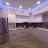 - Mətbəx mebeli: L formalı, ağ-parlaq fasadlar, sapqasız (gizli profil tutacaqlar). Üst dolablar boydan-boya, alt modullar geniş saxlama üçün çekmece və şkaflarla. Mermer naxışlı arxa panel, LED kontur işıqlandırma və spotlarla tavan dizaynı. Daxili yerləşim: qaz plitəsi üçün bölmə, soyuducu yeri, geniş iş masası.