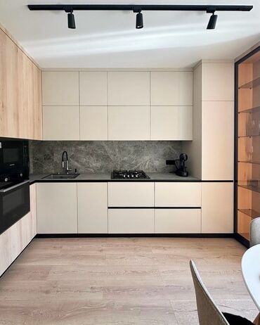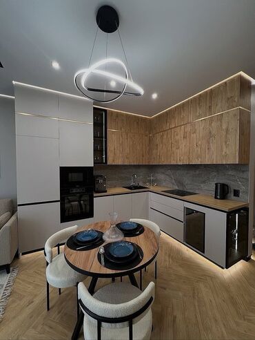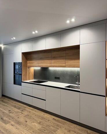 - Aksesuarlar: Yumşaq bağlanma (soft-close) menteşələr və relslər, qara mat miksersiz və ya paslanmayan polad lavabolar üçün uyğunlaşdırma. Quraşdırılmış LED lent işıqlandırma və iş zonasının lokal spotları.