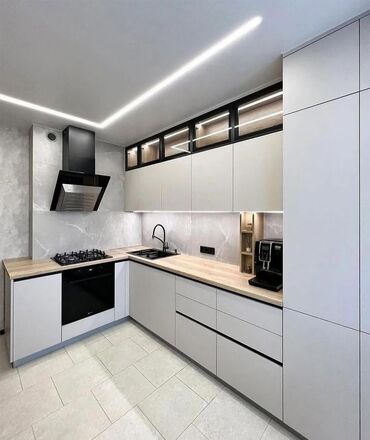- İşıqlandırma: Tavan xətti/spot LED, üst-alt dolab LED zolaqlar.