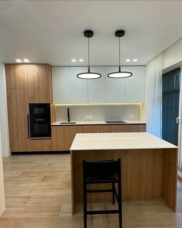 - İşıqlandırma: üst dolabaltı LED lent, tavanda spot və trek işıqlar; asma pendent lampalarla ada zonası.