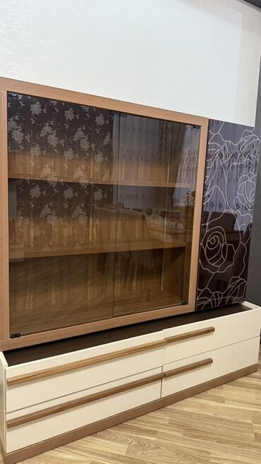 Satılır: Qonaq otağı üçün şkaf-vitrin və TV altlığı dəsti - Material: ağ-qəhvəyi rəng kombinasiyalı laminat/MDF - Dəst tərkibi: - Şkaf-vitrin: sağ tərəfdə şüşəli vitrin bölməsi, alt hissədə qapa...
