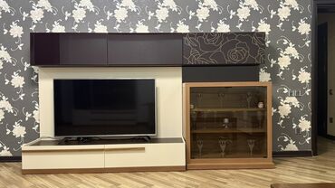 - Komplekt: aşağı TV altlığı (iki geniş çekmece), üst hissədə divara montaj olunan 3 qapalı saxlama bloku, sağ tərəfdə şüşə qapılı vitrin modul.