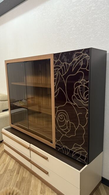 - Dizayn: krem rəngli baza, tünd qəhvəyi üst səth və panel, təbii ağac tonlarında çərçivələr; vitrin tərəfində gül naxışlı dekor panel.