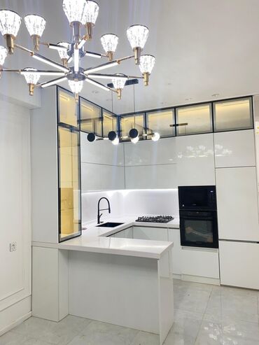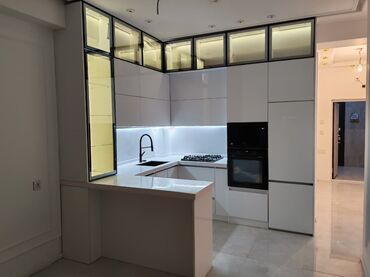 - Tavanadək vitrinli üst dolablar (şüşə qapılar, daxili LED işıqlandırma)