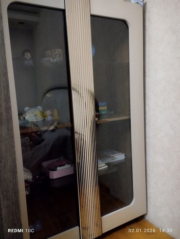 - Şkaf: Geniş ikiqapılı modul; iri sahəli tünt şüşə qapılar. Daxildə bir neçə geniş rəf; kitab, tekstil və ya aksesuarların səliqəli yerləşdirilməsi üçün. Mərkəzdə dekorativ şaquli panel möhkəm tutacaq rolunu oynayır.
