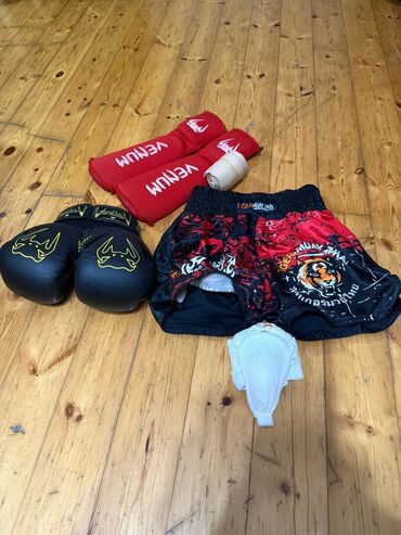 Boks üçün tam dəst Orjinal deyil!! - Brend: Adidas (əsas hissələr), ayaqqabı Asics - Rəng: qırmızı-ağ Dəstənin tərkibi: - Adidas boks maykası - Adidas boks şortu, elastik bel - Adidas başlıq (qırm...