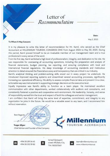Dövlət layihələri, istehsal, turizm və digər sahələrdə baş mühasib kimi çalışmışam