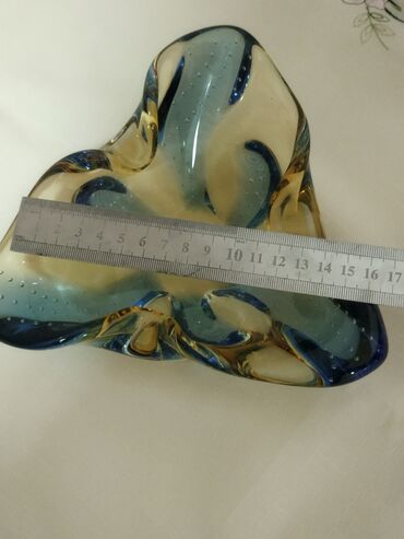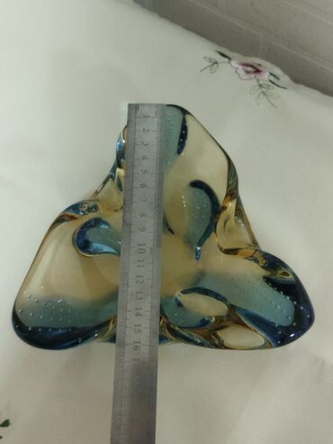 Əl işi olan, mavi və qəhvəyi rənglərin gözəl ahəngini özündə əks etdirən dekorativ şüşə qab. Qabın qeyri-adi forması və rəng keçidləri ona xüsusi bir cazibədarlıq verir. Mərkəz hissəsi şəffafdır. Evinizin dekoruna zəriflik qatacaqdır.