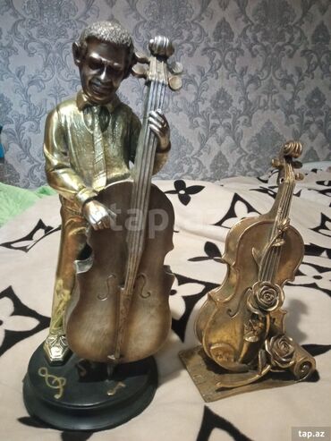 - Böyük heykəlcik: kontrabas çalan musiqiçi fiquru. Qızılı və bürünc tonlarda boyanmış, dairəvi qara postament üzərində. Detallı simlər, qəliblənmiş paltar qatları və not işarəli baza.