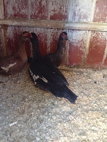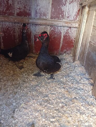 Muscovy (hinduşka) ördəkləri – qara lələklər, ağ ləkəli naxışlar və qırmızı karunkullar. Şəkillərdə bir neçə baş göstərilir.