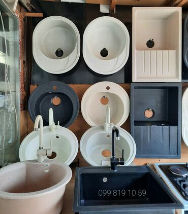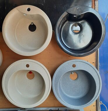 Mətbəx üçün müxtəlif ölçü və formalarda lavabolar - Material: əsasən qranit-kompozit və polimer qarışıqlı səthlər; həmçinin emallı/metal variant görünür - Formalar: dairəvi, kvadrat, düzbucaqlı; t...
