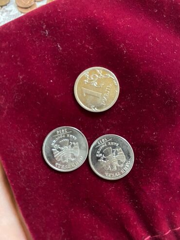 - Rusiya: 1 rubl nominalı (ön yüzdə “1 РУБЛЬ” yazısı və bitki ornamenti). Həmçinin “Банк России” yazılı, iki ədəd 10 qəpik tipli kiçik sikkə (obversdə iki başlı qartal və tarix 2014 görünür).
