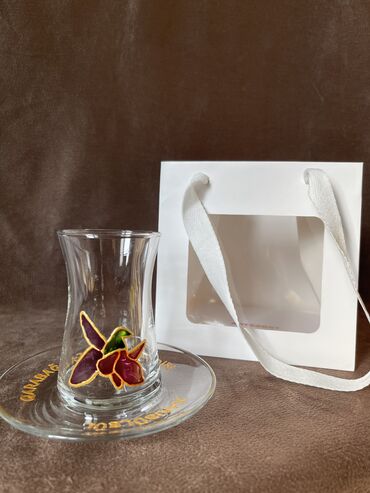 Dekorativ armudu stəkan və nəlbəki. Real stəkan kimi də istifadə olunur. Qutuda suvenir.