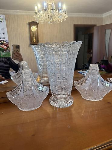 Kəpəkli kəsim naxışlı kristal dəst - Tərkib: 3 hissə - 1 ədəd hündür vaza (güldan) – enli ağız, qalın diblik, klassik “xrustal kəsim” bəzəkləri - 2 ədəd səbət formalı şirniyyat/çiçək qabı – or...