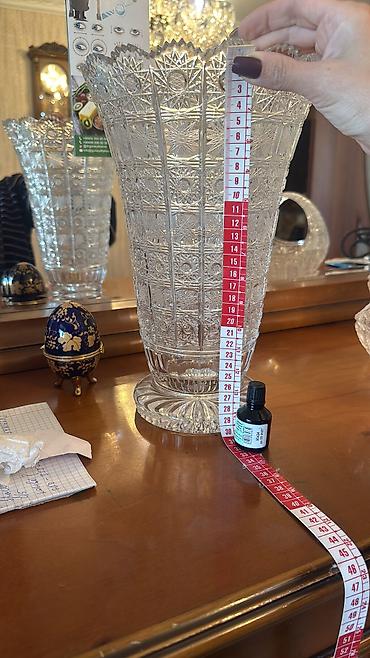 Kəsimli kristal vaza dəsti (2 ədəd) 1 ededi 17 manatdır gül qabın xurustaldı - Material: qalın, şəffaf kristal şüşə - Dizayn: əl işinə bənzər dərin kəsim naxışlar – ulduz və yarpaq motivləri, işığı...