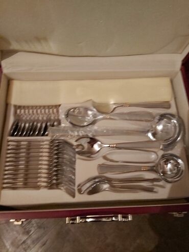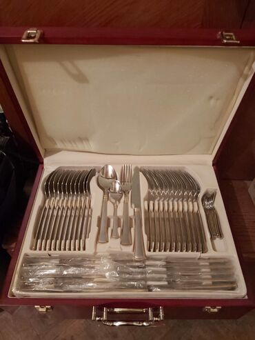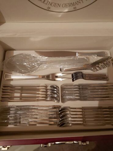 Almaniyadan alınıb.Brend mağazadan.Təmiz polad.1qutuda 1çay qaşığı q xörək qaşığı 1 çəngəl 1 bıcaq var.Arxa tərəfində zavodun möhürü var.30 avroya alınıb