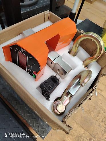 - Dəst: əsas tərəzi korpusu (metal gövdə, narıncı örtük), yuxarı şakl (D-şəkilli halqa), aşağı qarmaq, enerji adapteri, pult