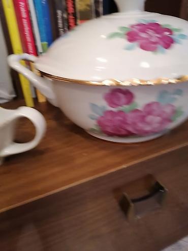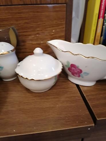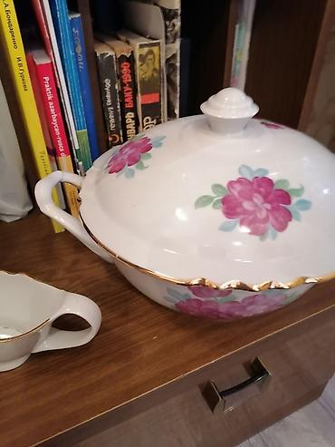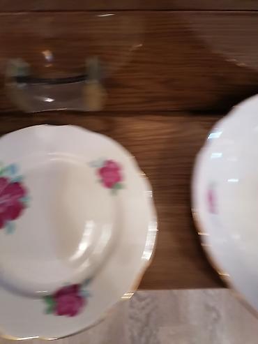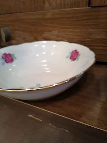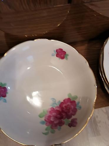 Çiçək naxışlı farfor süfrə dəsti - Material: nazik farfor/porseleyn - Rəng: ağ əsas, çoxrəngli (pastel) güllü naxışlar, kənarlarda incə bozumtul xətkeş - Üslub: klassik/retro, dalğalı kənarlı form...