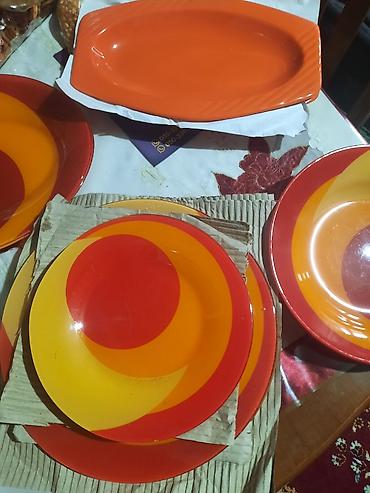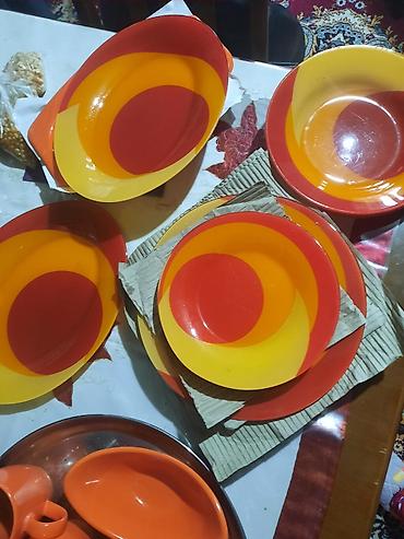 Yemək qabları dəsti – rəngli naxışlı boşqablar və servis ləvəsi - Dairəvi yemək boşqabı: Krem rəngli mərkəz, kənarda qırmızı və yaşıl rəngli ürəkvari/üşəvi naxışlı haşiyə. Gündəlik yemək və ya süf...