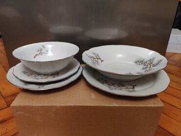 Boşqab dəsti 6 ədəd, əlavə 1 bulud qabı, ölçüləri şəkildə qeyd edilib. yenidir istifadə edilməyib. Nimçə dəsti