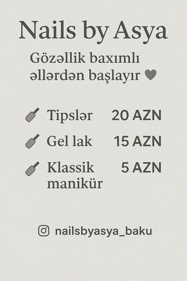 Xidmət: Professional manikür və qalıcı gel lak Təklif edilənlər: - Stiletto, badam və qısa yuvarlaq formalarda dırnaq dizaynları - Qalıcı gel lak tətbiqi: klassik tünd qırmızı, qara parlaq, gümüş ...