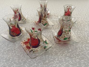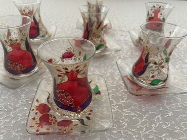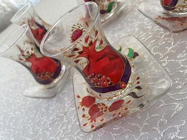 Şüşə çay stəkanları dəsti - 6 ədəd armudu formalı şüşə stəkan - Qızılı rəngli əsas/soket hissəsi ilə dekorativ dizayn - Dəstlə birlikdə uyğun ölçülü boşqabcıq/nəlbəkilər də var (qızılı haşiyəli) -...