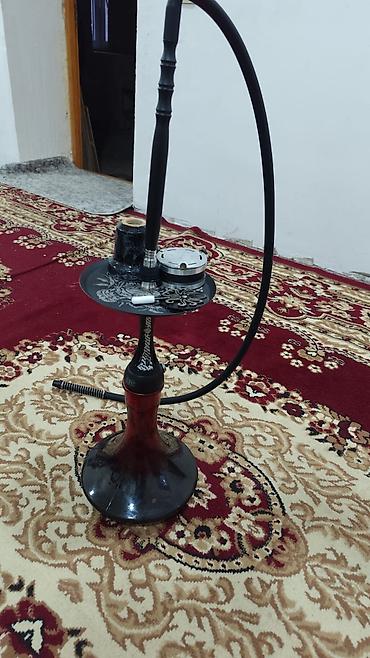 Kalyān (şişə nərgilə) komplekti - Rəng: qara şüşə baza, mavi/göy gövdə, qara şlanq - Materiallar: qalın şüşə baza, metal/gövdə hissələr, silikon şlanq - Üst hissə: keramika/qara kasa, kömür qapağ...