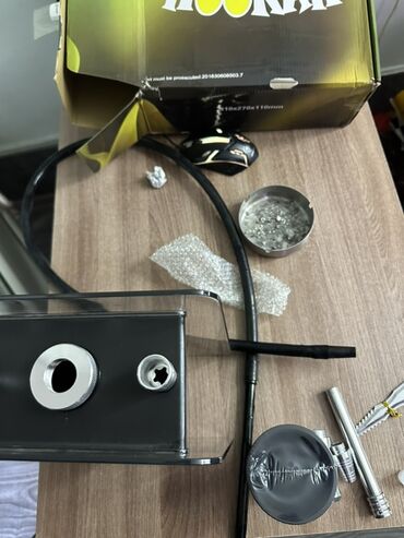 Şişə nərgilə dəsti Komplektə daxildir: - Şüşə kolba (tünd rəng), möhkəm və sabit baza - Metal şaxta və boşqab (paslanmayan material) - Silikon şlanq və metal ağızlıq - Kermik/daş künc (başlıq) və ...